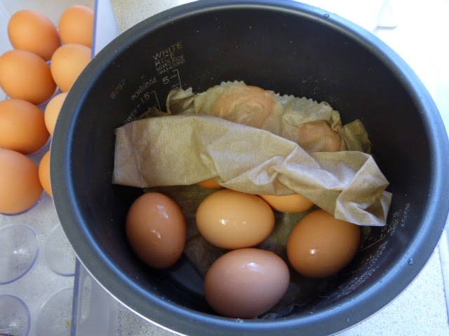 Thực ra, cách luộc này vẫn có nước nhưng không phải là nước ngập như bình thường, mà là nước sau khi rửa trứng vẫn còn vương trên trứng, và nước thấm vào giấy ăn.