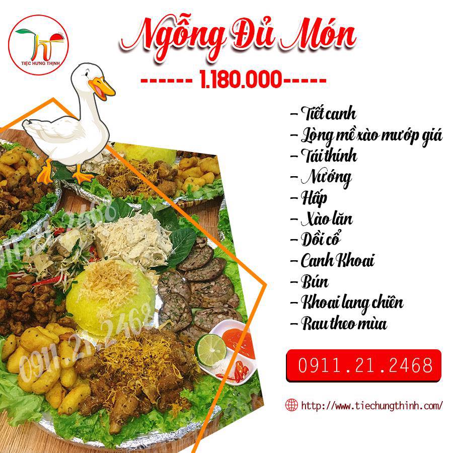+ Súp Gà xé nấm, Ngô chiên, Ngỗng dồi cổ, Ngỗng xào lăn, Ngỗng om măng, Rau cải xào tỏi, xôi vịt, bia, Kem Caramen.
