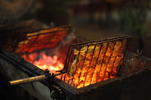 Bước 4: Trong quá trình nướng bếp than, nên để vịt cách mặt than khoảng 35cm để tránh bụi. Không nên để than tập trung vào giữa bếp, như vậy sẽ làm vịt cháy, vì thế chỉ nên xếp than xung quanh bếp, còn ở giữa để một lớp mỏng, nhiệt độ của than ở xung quanh vẫn đủ làm cá ở giữa chín. Hơn nữa, chỉ nên dùng một chiếc quạt gió nhỏ để thổi than. Nướng được 3,4 phút lại đổi chiều thịt vịt cho thịt chín đều